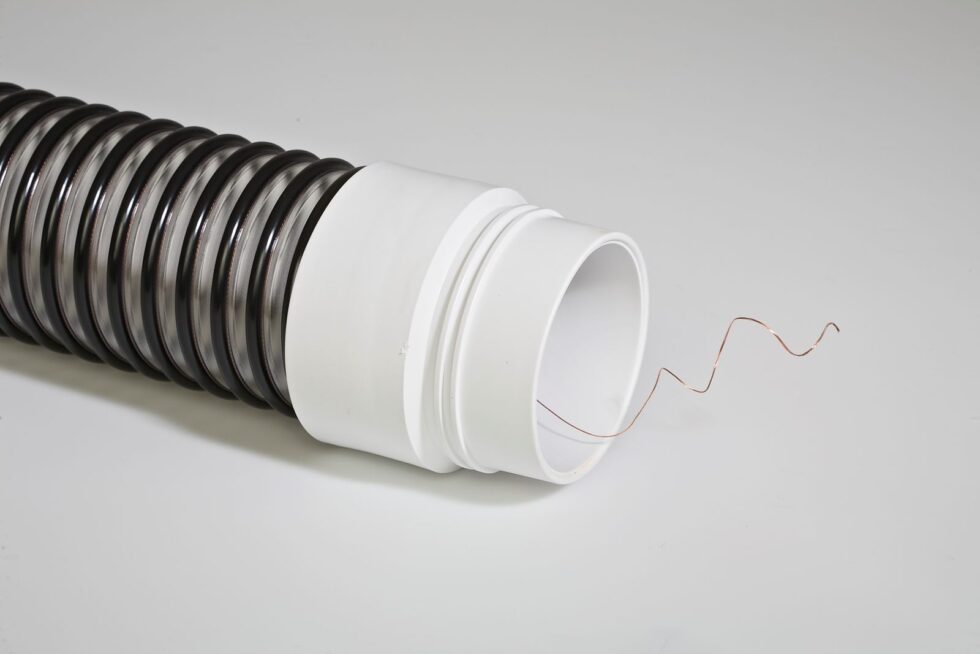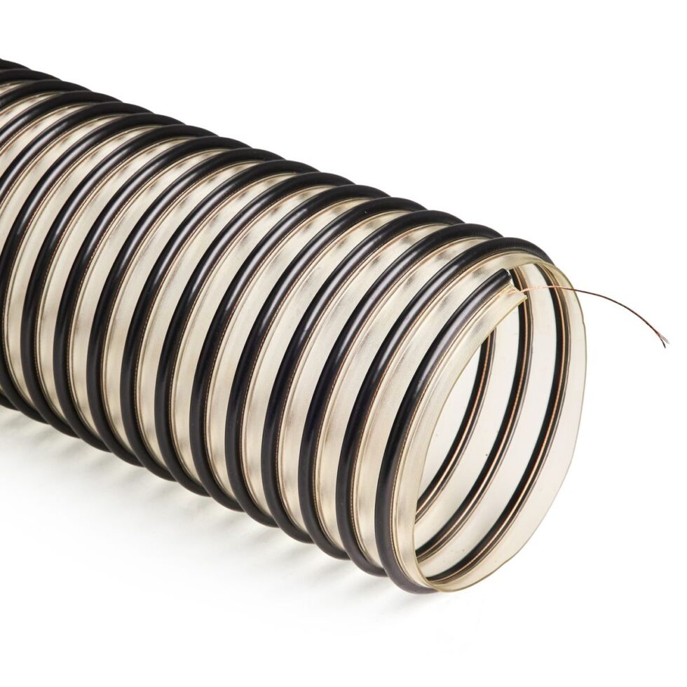 Specially formulated clear static dissipative thermoplastic polyurethane hose reinforced with a rigid black external ABS helix & an embedded copper braided grounding wire..