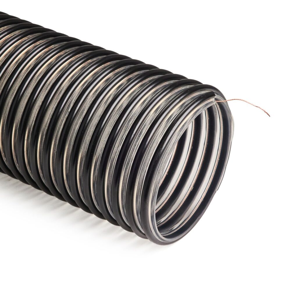 Specially formulated clear static dissipative very heavy weight thermoplastic polyurethane hose reinforced with a rigid black external ABS helix & an embedded copper braided grounding wire.