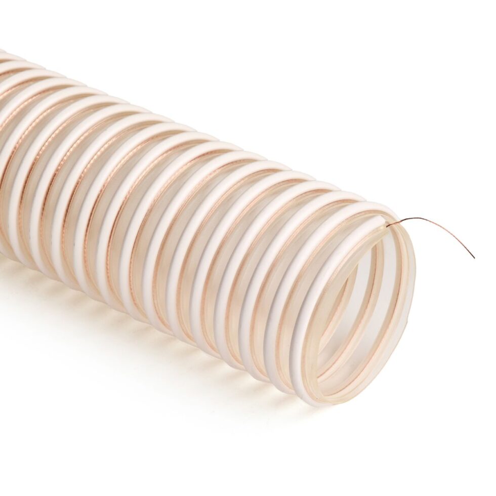 Specially formulated clear static dissipative thermoplastic polyurethane hose reinforced with a rigid white external ABS helix & an embedded copper braided grounding wire.