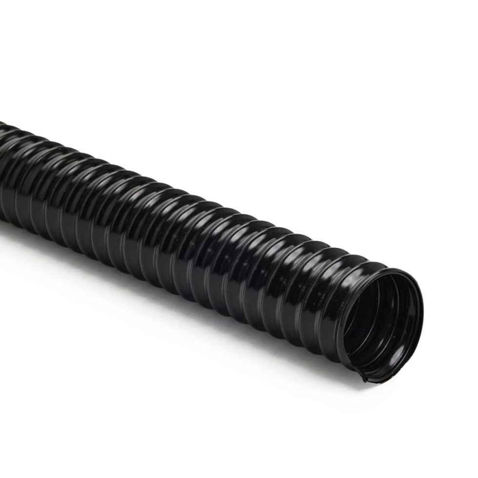 Black PVC hose reinforced with a coated spring steel wire helix.